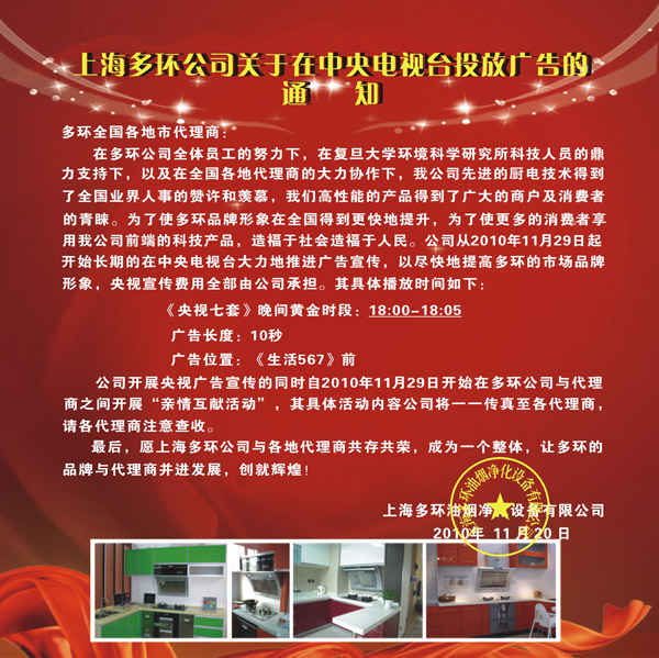 上海多環(huán)公司關(guān)于在中央電視臺投放廣告的通知