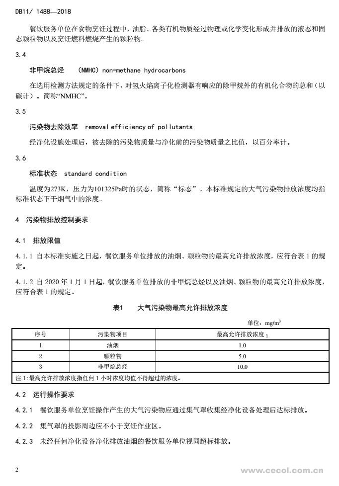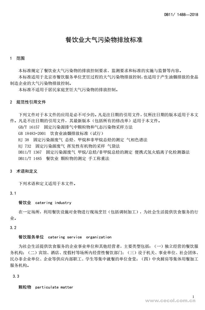 隨著社會經濟的發(fā)展和居民生活水平的提高,北京市餐飲業(yè)發(fā)展迅速,餐飲企業(yè)數量不斷增加、規(guī)模不斷擴大,餐飲業(yè)在烹飪過程中所產生的污染物排放也在不斷增加。為控制北京市餐飲業(yè)的大氣污染物排放,改善城市區(qū)域環(huán)境質量,引導和促進餐飲業(yè)污染治理技術進步,2018年1月8日,北京市制定并發(fā)布《餐飲業(yè)大氣污染物排放標準》(DB11/ 1488-2018)(以下簡稱“標準”)。